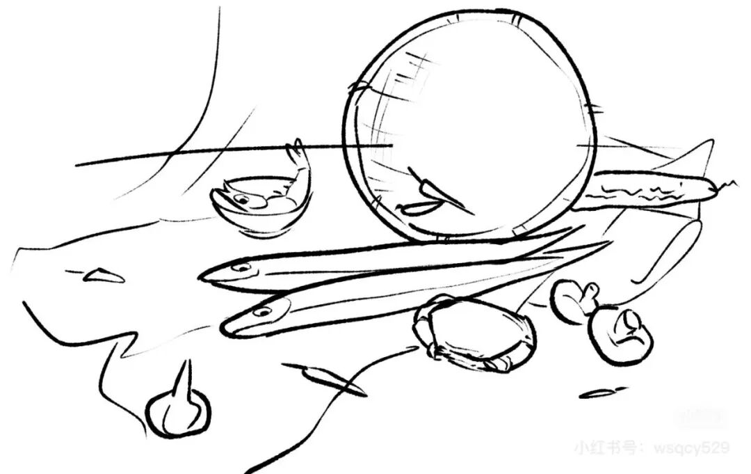 竹箩、两条带鱼、熟螃蟹、一个白碟(内有熟虾)一个苦瓜、一个大蒜、五个辣椒、两个蘑菇主体自,平放褐色布